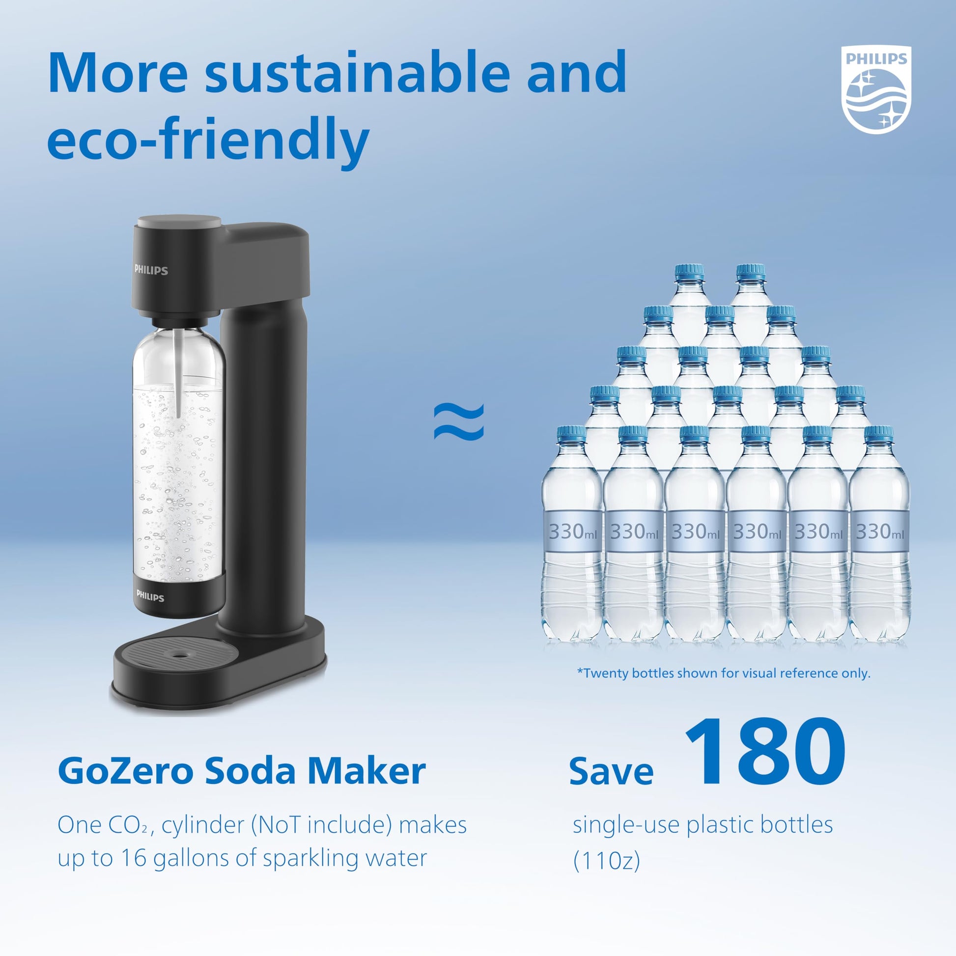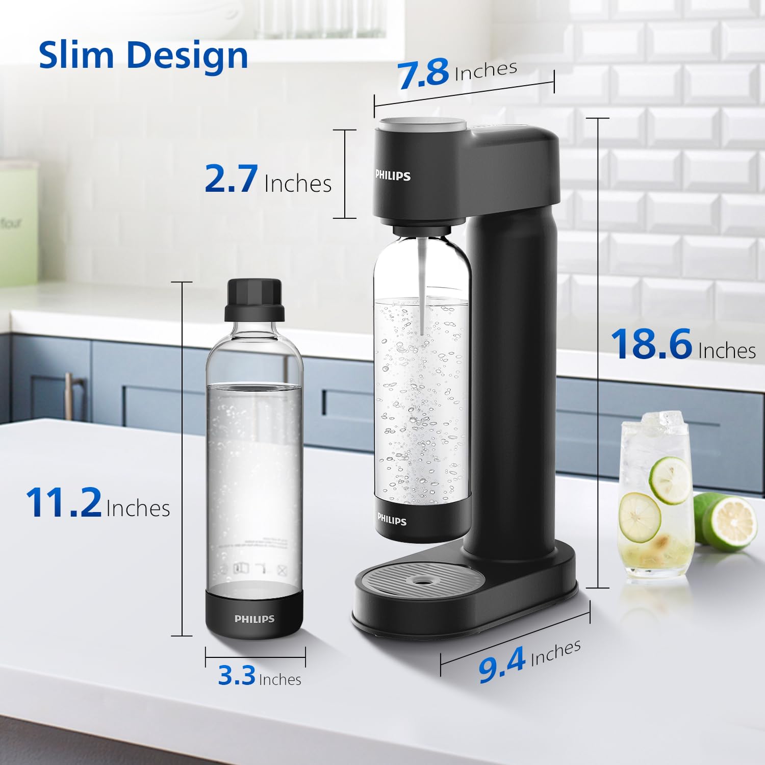 - Sleek and Stylish Design: Elevate your kitchen decor with the Philips Soda Maker’s elegant design. Its compact build seamlessly fits on any countertop, adding a modern touch while providing a soda machine that’s as attractive as it is functional.Dimension: 18.6” x 9.4” x 7.8”