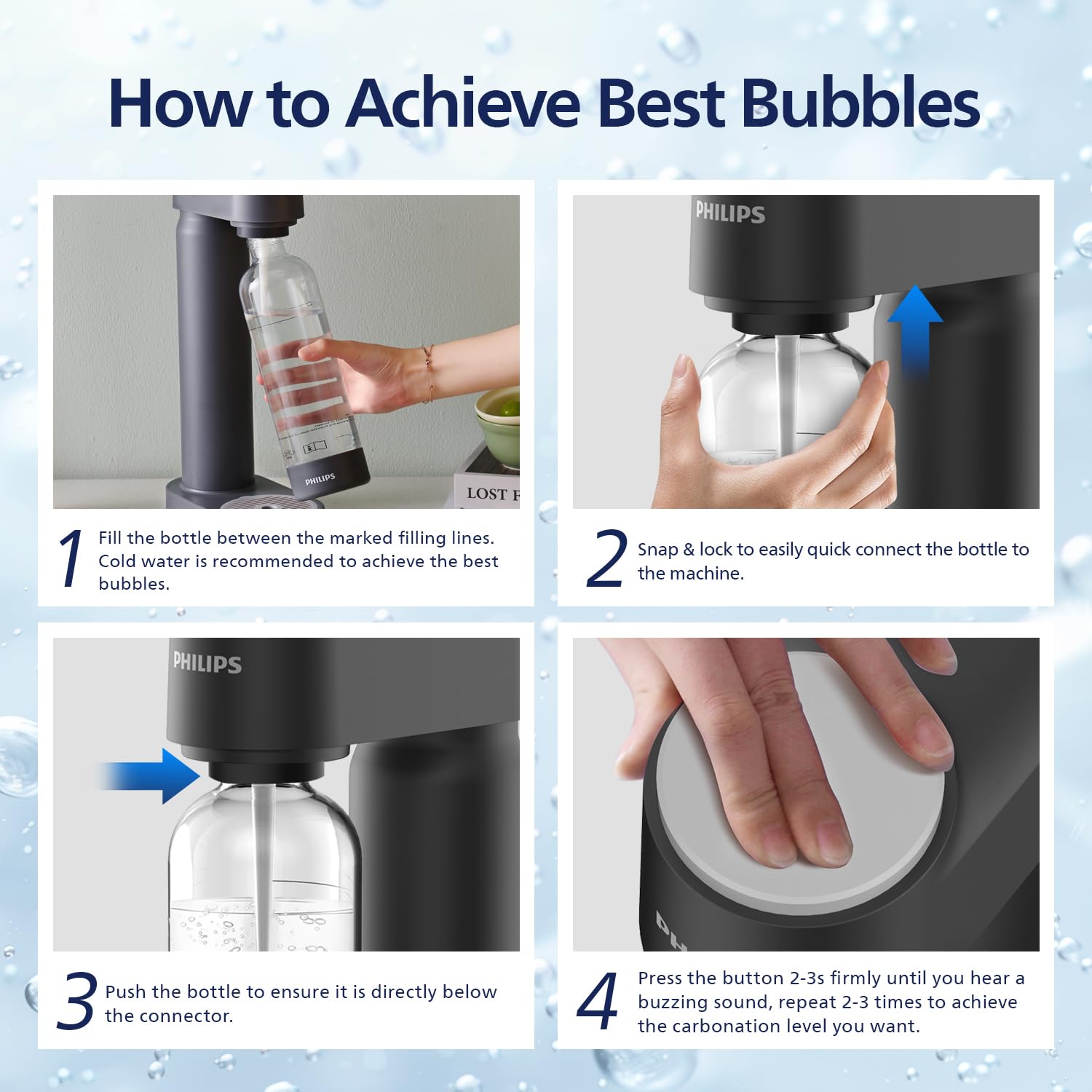 - Precision Engineering for Bubbles: Experience smooth and controlled carbonation with our advanced carbonation technology. With each press, enjoy a refined spray beam that ensures perfectly fizzy carbonated water and refreshing soda, Repeat 2-3 times to customize the carbonation level at your choice for tailored to your taste.